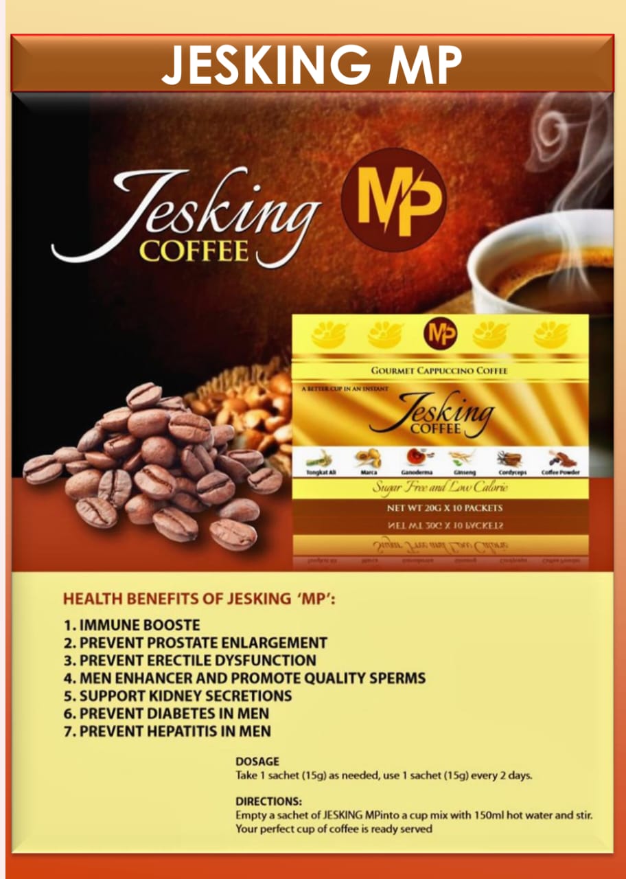 HEALTH BENEFITS OF JESKING ‘MP’: IMMUNE BOOSTE PREVENT PROSTATE ENLARGEMENT PREVENT ERECTILE DYSFUNCTION MEN ENHANCER AND PROMOTE QUALITY SPERMS SUPPORT KIDNEY SECRETIONS PREVENT DIABETES IN MEN PREVENT HEPATITIS IN MEN DOSAGE Take 1 sachet (15g) as ...